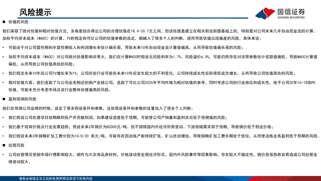 铜价、铜精矿加工费(TC/RC)、硫酸价格波动风险。