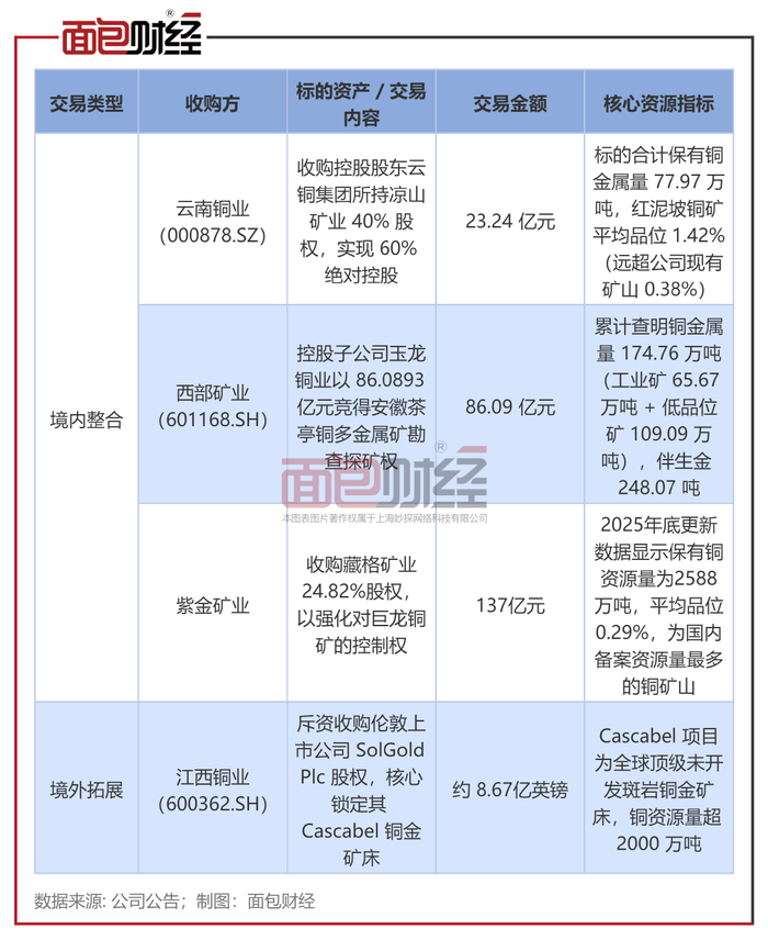 云南铜业的整合动作是2025年以来矿企并购热潮的缩影,以下为部分大型收购案例: