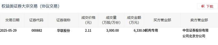 华联股份今日大宗交易折价成交3000万股,成交额6330万元