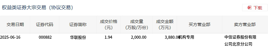 华联股份今日大宗交易折价成交2000万股,成交额3880万元