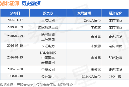 【投融资动态】湖北能源定向增发融资,融资额29亿人民币,投资方为三峡集团