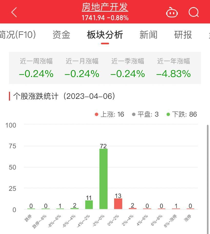 中国经济网北京4月6日讯 今日,房地产开发板块整体跌幅0.88%,其中16只股票上涨,3只股票平盘,86只股票下跌。