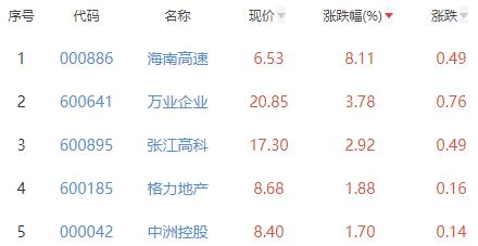其中,海南高速、万业企业、张江高科、格力地产、中洲控股位列板块涨幅前五位,涨幅分别为8.11%、3.78%、2.92%、1.88%、1.70%。