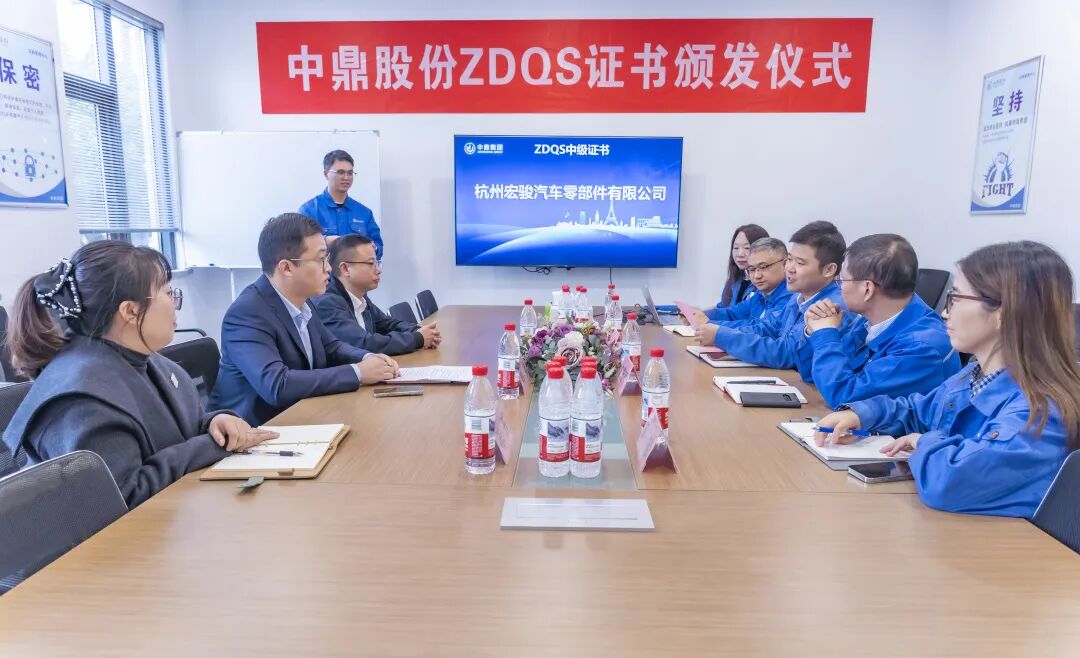 作为中鼎集团供应商管理的里程碑事件,现场正式签发了中鼎股份ZDQS认证第一张中级证书,中鼎战略合作伙伴——杭州宏骏汽车零部件有限公司成为第一个获得认证的企业。