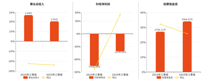 公司营业总收入为2.05亿元,在已披露的同业公司中排名第23,较去年同报告期营业总收入减少6479.92万元,同比较去年同期下降24.06%。归母净利润为-2276.54万元,在已披露的同业公司中排名第25。经营活动现金净流入为3466.07万元。