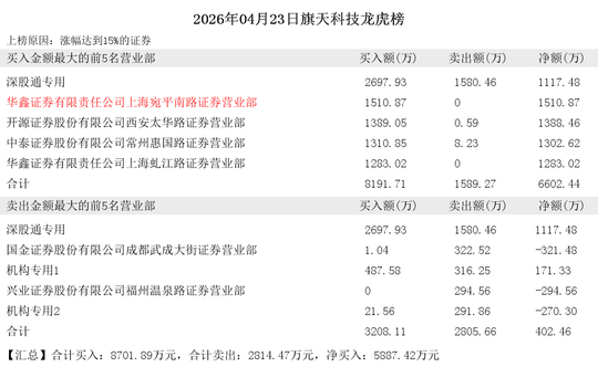 卖出前5席为:机构专用4、国信证券股份有限公司浙江互联网分公司、申万宏源证券有限公司济南历山路证券营业部、机构专用5、东方财富证券股份有限公司昌都两江大道证券营业部。共计买入:10671.75万元,共计卖出:15572.48万元。