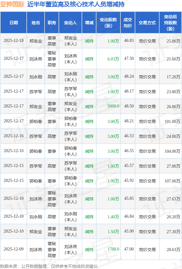 亚钾国际近半年内的董监高及核心技术人员增减持详情如下: