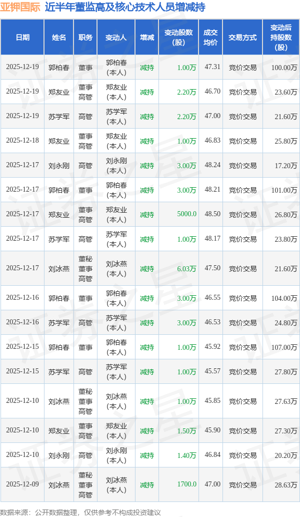 亚钾国际近半年内的董监高及核心技术人员增减持详情如下: