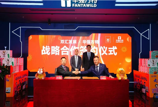 此次签约在华强方特集团总部举行,双汇发展营销负责人李凯、华强方特集团副总裁陈祖尧作为双方代表现场签约,双汇发展董事长万宏伟、华强方特集团董事长刘道强共同见证了这一历史性时刻。