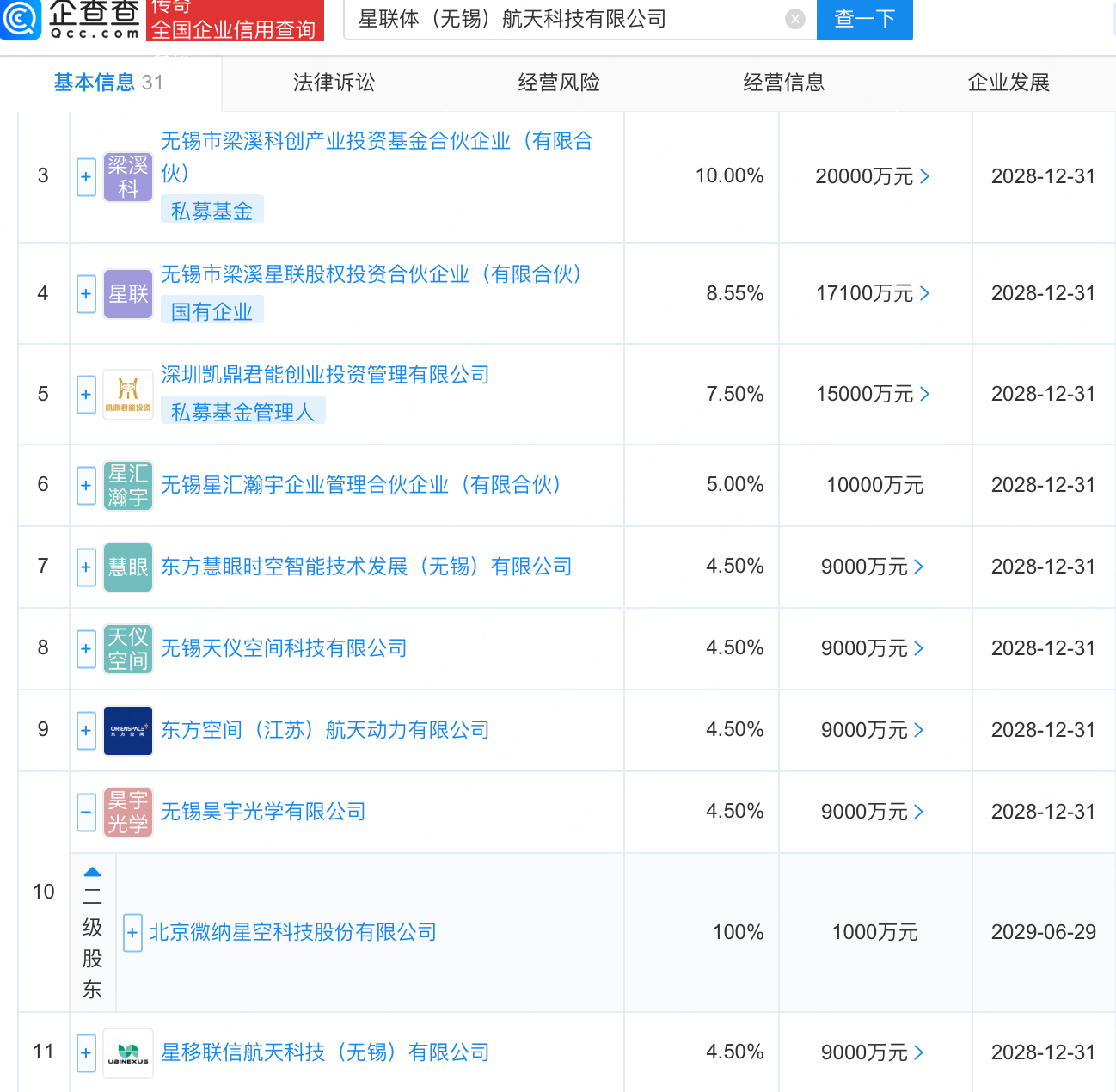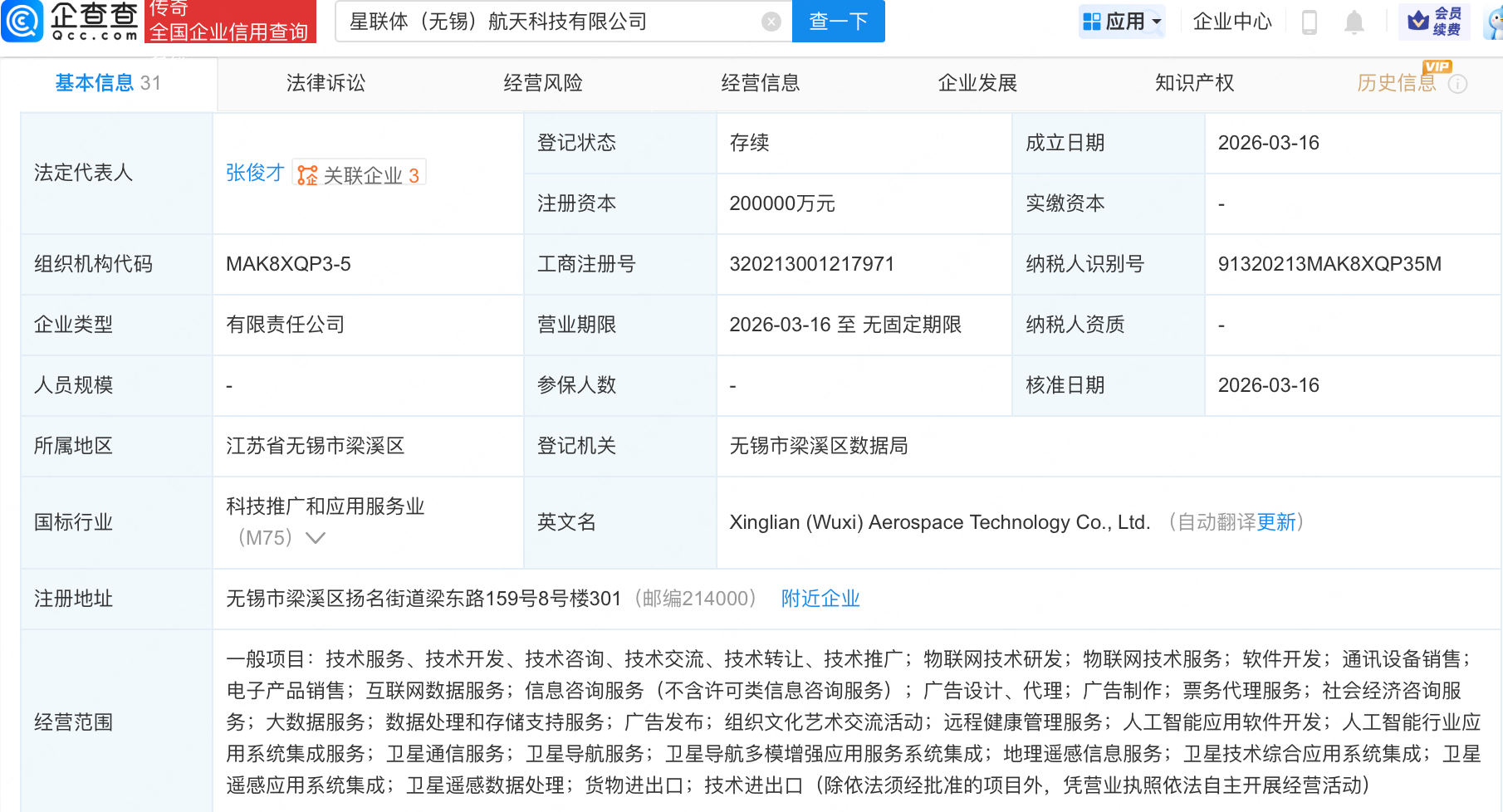 企查查APP显示,近日,星联体(无锡)航天科技有限公司成立,注册资本20亿元,经营范围包含:人工智能应用软件开发;人工智能行业应用系统集成服务;卫星通信服务;卫星导航服务;卫星导航多模增强应用服务系统集成等。企查查股权穿透显示,该公司由北京微纳星空科技股份有限公司全资子公司无锡昊宇光学有限公司等共同持股。