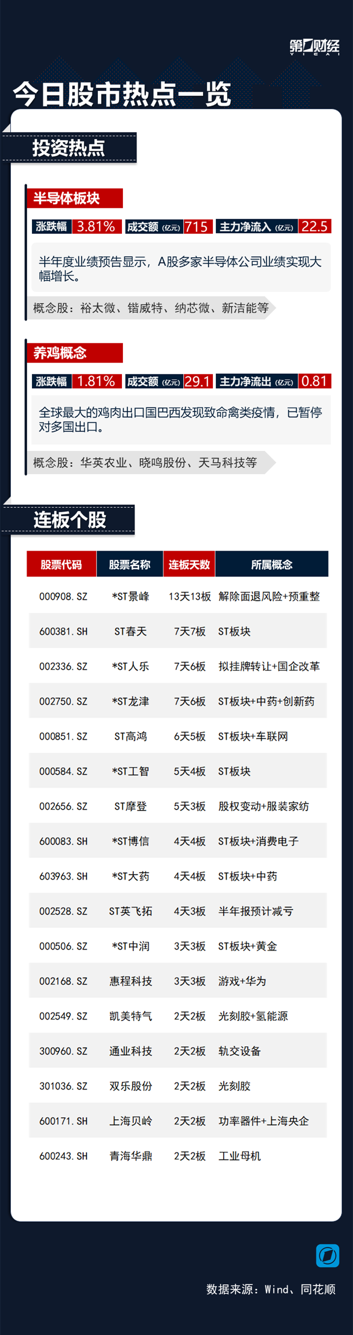 板块方面,半导体板块集体上涨,半年度业绩预告显示,A股多家半导体公司业绩实现大幅增长。养鸡概念活跃,全球最大的鸡肉出口国巴西发现致命禽类疫情,已暂停对多国出口。