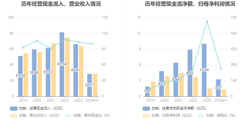 2024年上半年,公司经营活动现金流净额为3.27亿元,同比增长5.97%;筹资活动现金流净额-2.99亿元,同比减少4.85亿元,主要系票据贴现和票据保证金减少所致;投资活动现金流净额-3.43亿元,上年同期为-4.14亿元。