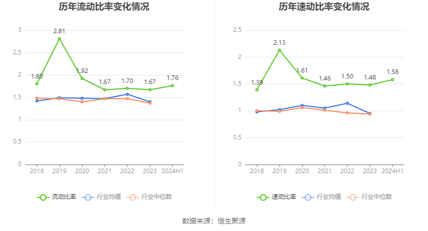 2024年上半年,公司流动比率为1.76,速动比率为1.58。