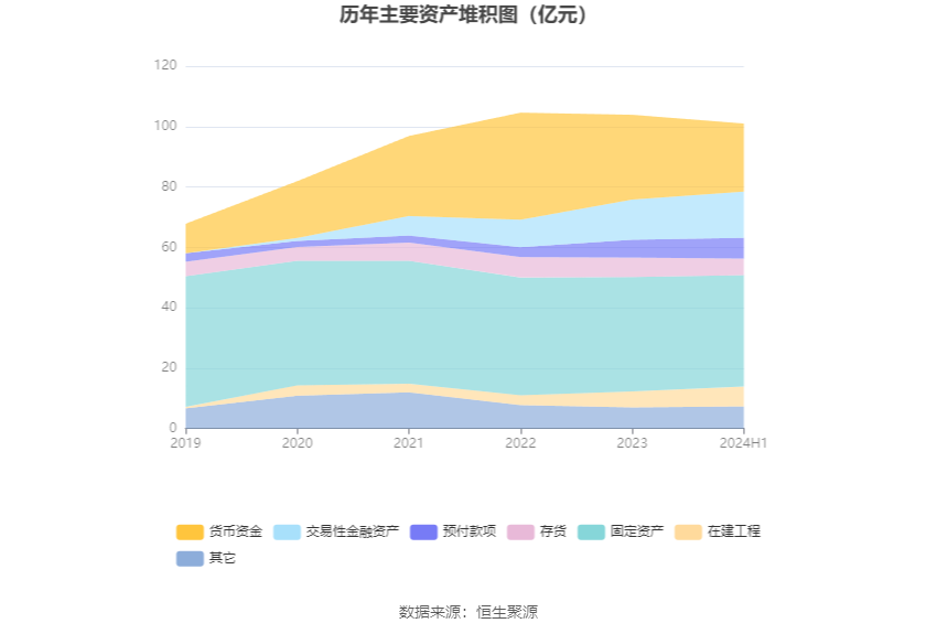 资产重大变化方面,截至2024年上半年末,公司货币资金较上年末减少19.72%,占公司总资产比重下降4.71个百分点;交易性金融资产较上年末增加15.04%,占公司总资产比重上升2.35个百分点;在建工程较上年末增加23.68%,占公司总资产比重上升1.38个百分点;预付款项较上年末增加16.52%,占公司总资产比重上升1.13个百分点。