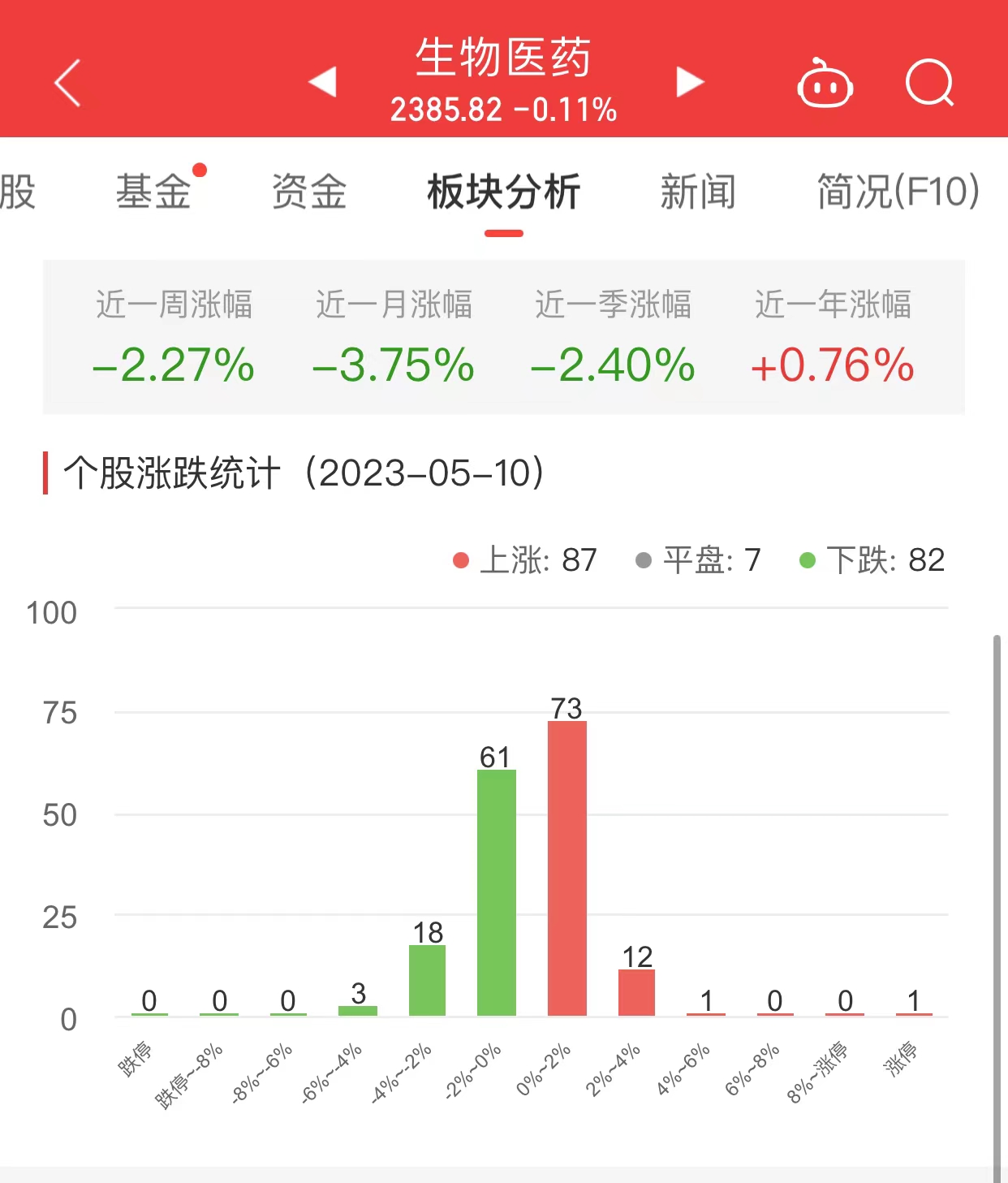 中国经济网北京5月10日讯今日,生物医药板块整体跌幅0.11%,其中87只股票上涨,7只股票平盘,82只股票下跌。