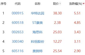 其中,华特达因、ST康美、海思科、科恒股份、奥锐特位列板块涨幅前五位,涨幅分别为5.51%、4.85%、3.43%、3.11%、2.90%。