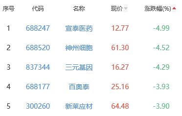 宣泰医药、神州细胞、三元基因、百奥泰、新莱应材位列涨幅榜后五位,涨幅分别为-4.99%、-4.52%、-4.29%、-3.93%、-3.90%。