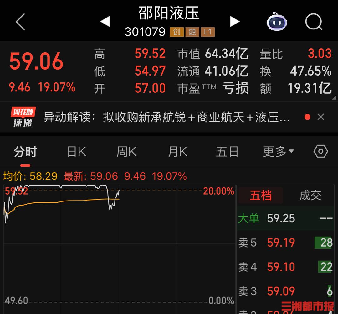 值得注意的是,早盘商业航天板块继续走强,20余只股票盘中触及涨停。其中,湘股邵阳液压盘中20%涨停,蓝思科技盘中一度涨超18%,截至午间休盘,两股分别涨超19%和12%。