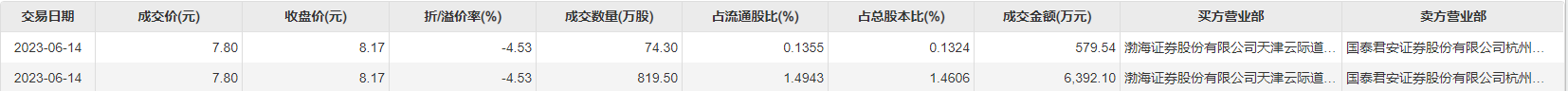 6月14日大宗交易成交893.8万股,成交额6971.64万元,占当日总成交额的33.17%,成交价7.8元,较市场收盘价8.17元折价4.53%。