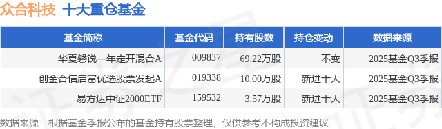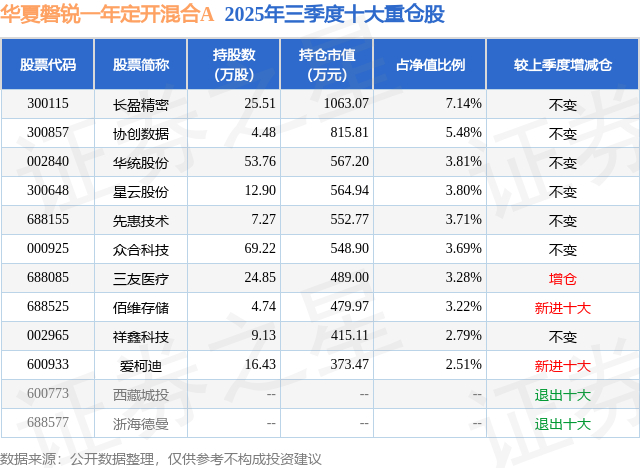 根据2025基金Q3季报公募基金重仓股数据,重仓该股的公募基金共3家,其中持有数量最多的公募基金为华夏基金的华夏磐锐一年定开混合A。华夏磐锐一年定开混合A目前规模为1.37亿元,最新净值1.9114(1月16日),较上一交易日上涨0.81%,近一年上涨63.51%。该公募基金现任基金经理为张城源。张城源在任的基金产品包括:华夏磐泰混合(LOF)A,管理时间为2016年12月26日至今,期间收益率为83.21%;华夏磐利一年定开混合A,管理时间为2020年7月29日至今,期间收益率为104.42%;华夏磐益一年定开混合,管理时间为2021年1月26日至今,期间收益率为62.74%。