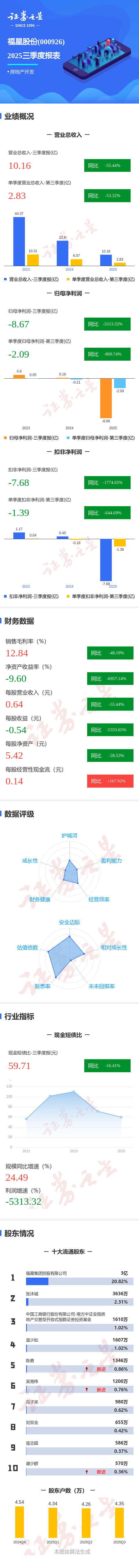 证券之星消息,福星股份2025年三季报显示,前三季度公司主营收入10.16亿元,同比下降55.45%;归母净利润-8.67亿元,同比下降5313.32%;扣非净利润-7.68亿元,同比下降1774.65%;其中2025年第三季度,公司单季度主营收入2.83亿元,同比下降53.32%;单季度归母净利润-2.09亿元,同比下降869.74%;单季度扣非净利润-1.39亿元,同比下降644.7%;负债率65.87%,投资收益-8046.85万元,财务费用2.47亿元,毛利率12.84%。