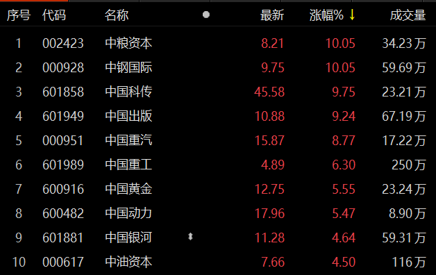 上证报中国证券网讯 5月4日,“中字头”股票走强,截至10:12,中钢国际、中粮资本涨停,中国科传、中国出版大涨超9%,中国重汽、中国重工等涨超6%。