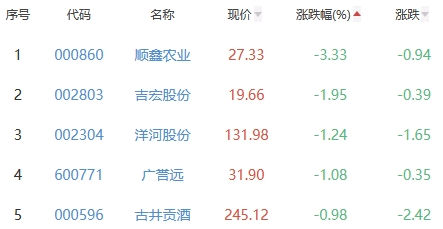 顺鑫农业、吉宏股份、洋河股份、广誉远、古井贡酒位列涨幅榜后五位,涨幅分别为-3.33%、-1.95%、-1.24%、-1.08%、-0.98%。