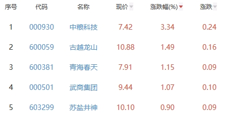 其中,中粮科技、古越龙山、青海春天、武商集团、苏盐井神位列板块涨幅前五位,涨幅分别为3.34%、1.49%、1.15%、1.07%、0.90%。