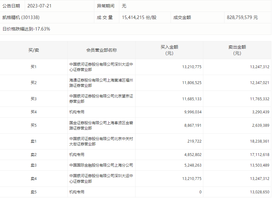 7月21日,凯格精机今日跌17.63%,龙虎榜数据显示,上榜营业部席位全天成交1.71亿元,占当日总成交金额比例为20.64%。其中,买入金额为6588.64万元,卖出金额为1.05亿元,合计净卖出3928.62万元。