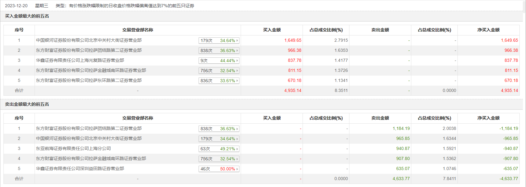 12月20日,国旅联合今日跌停,全天换手率达18.7%,振幅达6.05%。龙虎榜数据显示,营业部席位合计净买入301.37万元。其中,东方财富证券拉萨团结路第二证券营业部、中国银河证券北京中关村大街证券营业部分别卖出1184.19万元、965.85万元;中国银河证券北京中关村大街证券营业部、东方财富证券拉萨团结路第二证券营业部分别买入1649.65万元、966.38万元。