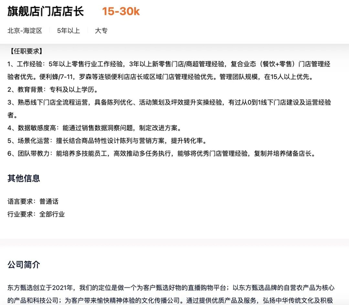 12月3日,据北京商报报道,东方甄选全国百家门店计划正迈出第一步——其正以1.5万至3万元薪资招聘北京首家旗舰店的店长,优先考虑具备“餐饮+零售”复合业态管理经验的人才。