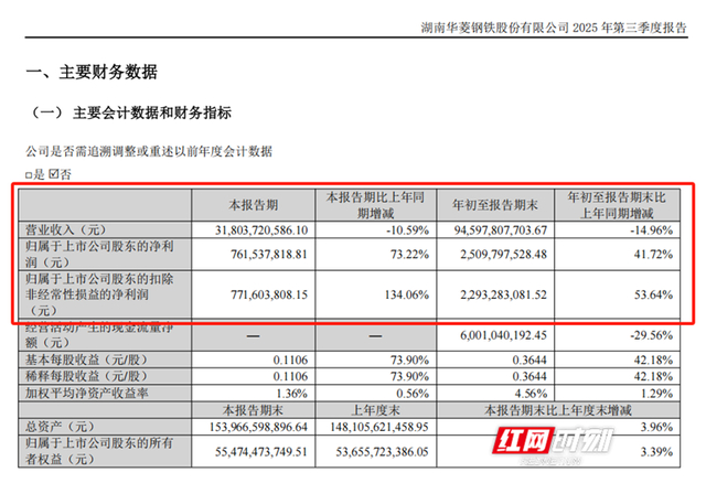 华菱钢铁2025年三季报显示,公司2025年1-9月实现营业收入 945.98亿元,实现归母净利润25.10亿元,同比增长42%。其中,第三季度归母净利润7.62亿元,同比增长73%。