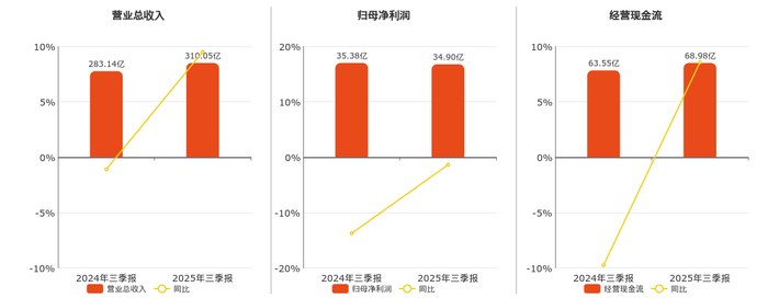 公司营业总收入为310.05亿元,较去年同报告期营业总收入增加26.91亿元,同比较去年同期上涨9.50%。归母净利润为34.90亿元,较去年同报告期归母净利润减少4867.75万元,同比较去年同期下降1.38%。经营活动现金净流入为68.98亿元,较去年同报告期经营活动现金净流入增加5.44亿元,同比较去年同期上涨8.56%。