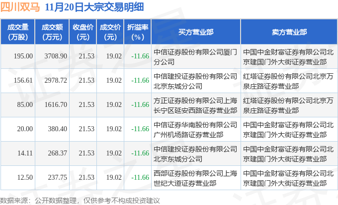 11月20日四川双马现6笔折价11.66%的大宗交易 合计成交9190.84万元