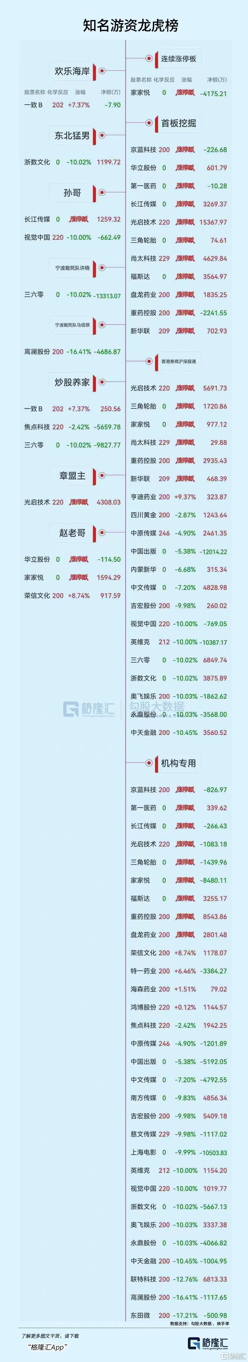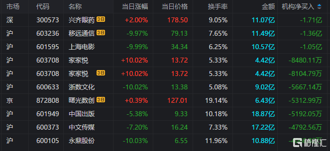 龙虎榜中涉及机构专用席位的个股中,当日净卖出额前三为上海电影、家家悦、浙数文化,分别为1.05亿元、8480.11万元、5667.14万元。