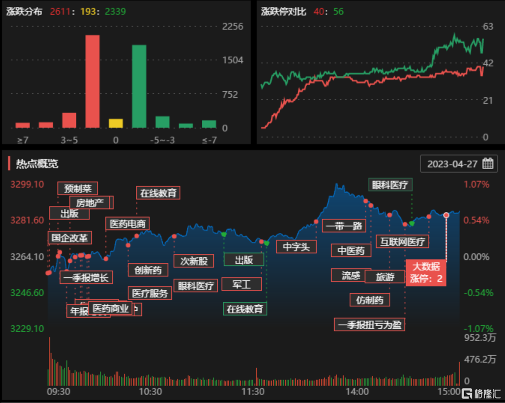 4月26日,A股三大指数全天大幅震荡,个股涨跌互现,超2600只个股上涨,2339只个股下跌。沪深两市全天成交额10449亿元,北向资金净卖出1.67亿元。