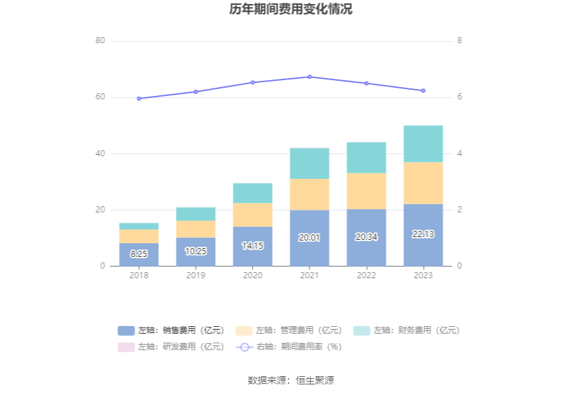 2023年,公司期间费用为50.02亿元,较上年同期增加5.91亿元;但期间费用率为6.24%,较上年同期下降0.26个百分点。其中,销售费用同比增长8.83%,管理费用同比增长16.16%,研发费用同比下降88.15%,财务费用同比增长18.99%。