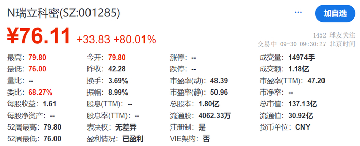 瑞财经 王敏9月30日,N瑞立科密(SZ:001285)在深交所主板挂牌上市,保荐机构为中信证券,开盘涨80%,总市值137亿元。