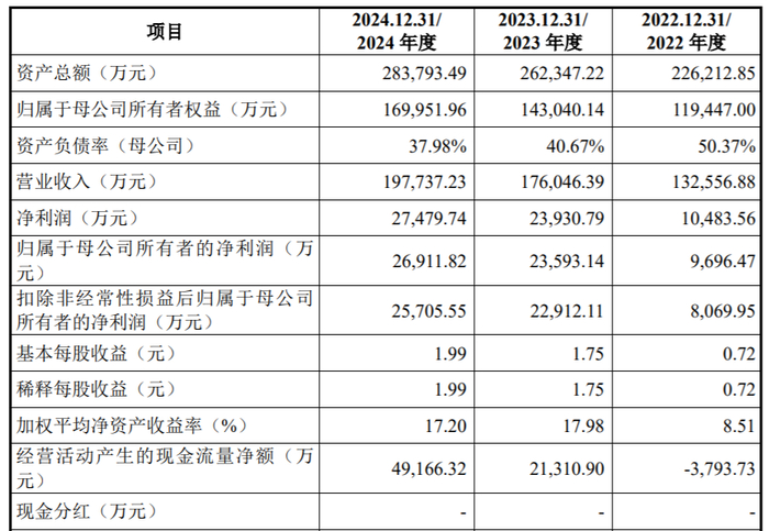 业绩方面,2022年至2024年,公司实现营业收入13.26亿元、17.60亿元和19.77亿元;归属于母公司股东的净利润分别为0.97亿元、2.36亿元和2.69亿元。