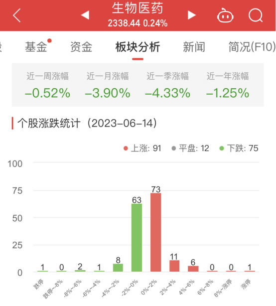 中国经济网北京6月14日讯今日,生物医药板块整体涨幅0.24%,其中91只股票上涨,12只股票平盘,75只股票下跌。