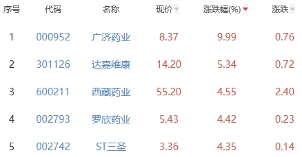 其中,广济药业、达嘉维康、西藏药业、罗欣药业、ST三圣位列板块涨幅前五位,涨幅分别为9.99%、5.34%、4.55%、4.42%、4.35%。
