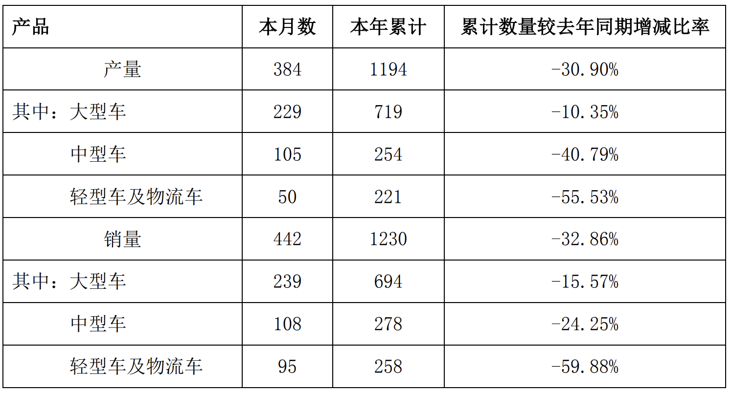 中通客车:前3月累计销量1230辆,同比下滑32.86%