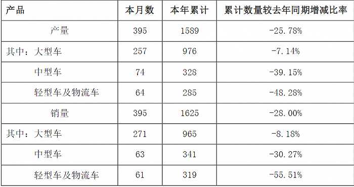 5月5日公告,公司前4月销量1625辆,同比下滑28%。