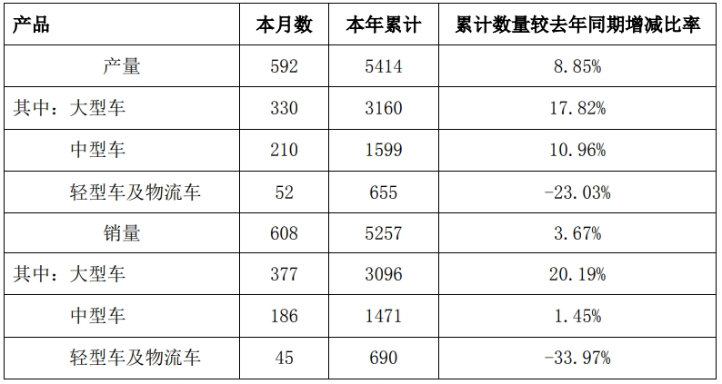 10月10日公告,前9月累计生产汽车5414辆,同比增长8.85%;累计销售5257辆,同比增长3.67%。