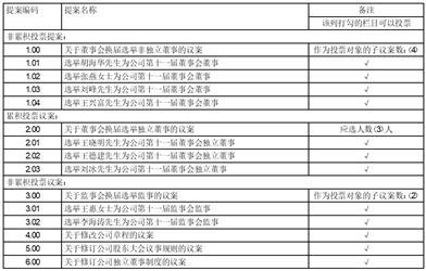 3、议案2.00为累积投票议案,股东所拥有的选举票数为其所持有表决权的股份数量乘以应选人数,股东可以将所拥有的选举票数以应选人数为限在候选人中任意分配(可以投出零票),但总数不得超过其拥有的选举票数。