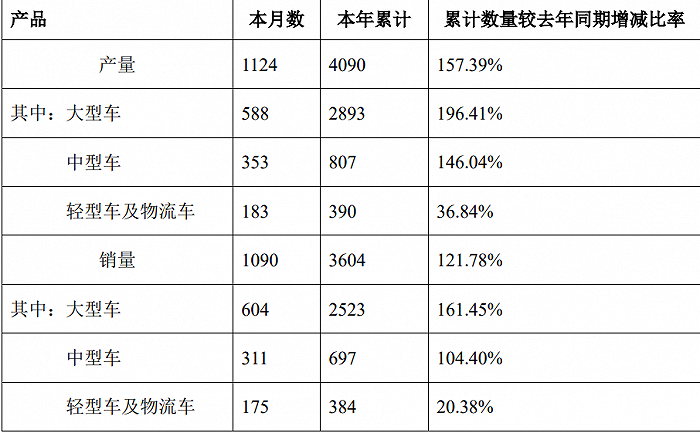 5月10日公告,前4月销量合计3604辆,同比增长121.78%。