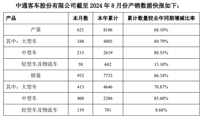 公告,公司2024年8月销量952辆;1-8月销量7733辆,同比增长66.34%。