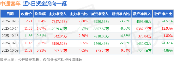 10月15日的资金流向数据方面,主力资金净流入7847.16万元,占总成交额7.8%,游资资金净流出3250.56万元,占总成交额3.23%,散户资金净流出4596.6万元,占总成交额4.57%。