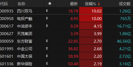 上证报中国证券网讯 10月22日早盘,非银金融板块表现活跃。截至9时39分,四川双马、电投产融涨停。中油资本涨超4%,天茂集团涨逾3%,东方财富、中金公司、中国太保等跟涨。