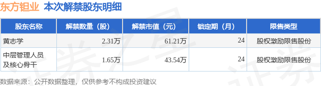 东方钽业(000962)3.96万股限售股将于10月22日解禁,占总股本0.01%